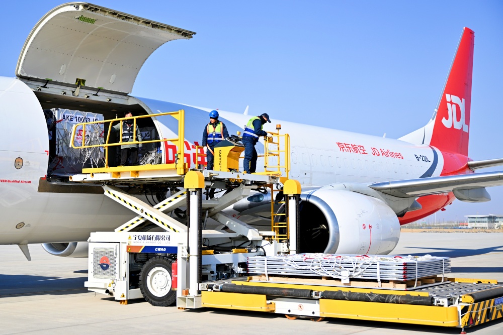 1月20日,银川河东国际机场,京东航空全货机正在进行宁夏牛羊肉装载作业。 今年是京东物流第三年开通宁夏牛羊肉全货机航线,较去年增加了3个飞行班次,每趟航班可搭载18吨牛羊肉,其中北京、上海、广州等城市可实现最快次日到达。记者 王鼎 马赛尔 摄