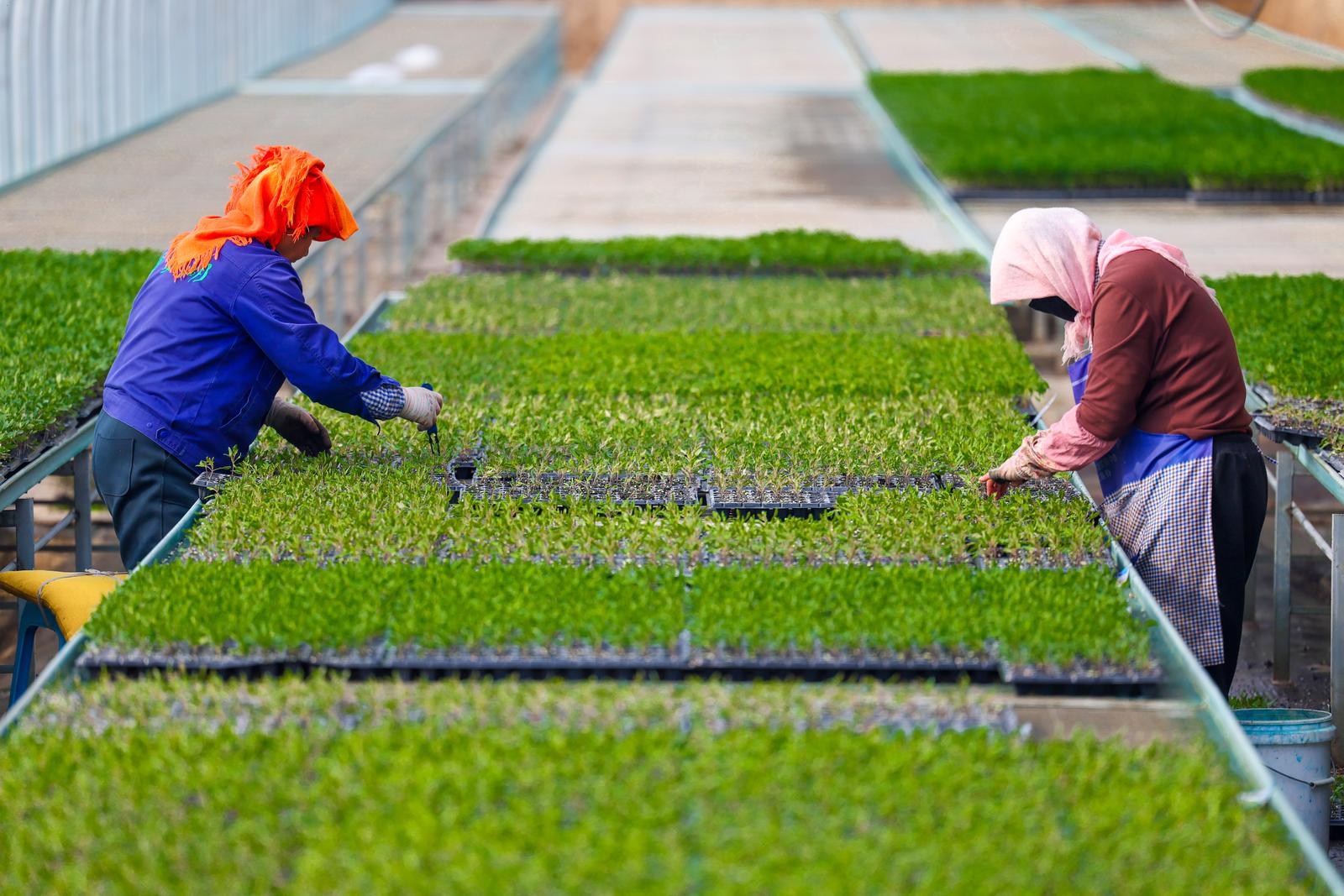 1月23日,位于银川市兴庆区掌政镇五渡桥村农业产业示范园的宁夏艾尚农业科技有限公司育苗大棚内,务工人员在查看幼苗长势。今年,该公司10栋大棚里同时培育了辣椒、西红柿、芹菜、西瓜等多个品种,育苗量达到250万株以上。目前,通过园区搭建的标准化种植平台,育苗环节与下游种植户紧密衔接,形成了“订单培育—技术指导—销售”的链条。 记者 李宏亮 摄