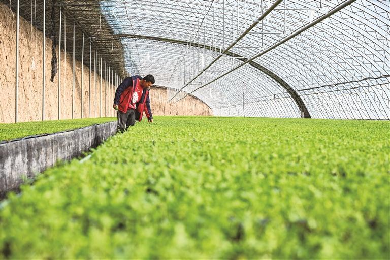 中卫市丰盈先行农业科技有限公司技术员侯启飞查看种苗长势。
