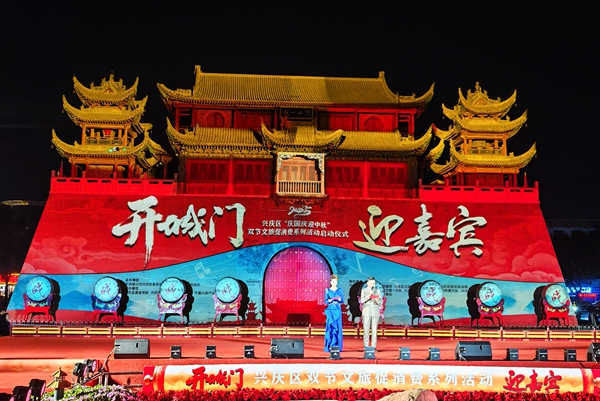 宁夏新闻网讯(记者 姚振国 文/图)9月29日晚,玉皇阁-鼓楼灯火璀璨,“开城门 迎嘉宾”2025年兴庆区“庆国庆迎中秋”双节文旅促消费系列活动在此启幕。本次活动在去年成功点亮标志性古建筑鼓楼-玉皇阁的基础上,持续强化其历史文化地标与旅游展示功能,焕活鼓楼-玉皇阁历史文化街区,“盛世华诞・梦回兴庆”沉浸式演绎与“天幕为卷 汉印千年”无人机烟花秀同步上演,为市民游客献上一场兼具文化深度与视觉冲击的文旅盛宴,点燃双节消费热情。
