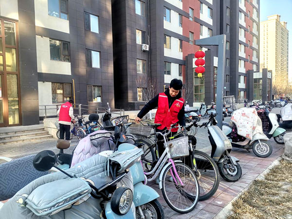 非机动车辆摆放组则针对小区内乱停乱放、占用消防通道、挤占公共空间的电动车、自行车等进行集中整理,大家分工协作,弯腰扶正、有序摆放,将车辆统一归置到指定停车区域,同时主动向过往居民宣传文明停放知识,引导居民自觉遵守社区秩序,共同维护整洁环境。