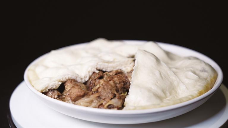 时光流转,烹饪的器具在更新,制作的工艺在精进,但面包羊羔肉的核心风味,却在代代相传中始终未变。海原农人至今遵循着传统的做法,从选料到烹饪,每一步都藏着匠心。选取三月龄羔羊,肉质最是鲜嫩,带骨切块后用清水浸泡去腥,只加少许盐与现磨的小茴香粉腌制。腌制好的羊肉入铁锅,慢炖至酥烂,汤汁浓稠地裹在肉块上,再将发酵好的面团擀成薄饼,盖在碗上,利用炖肉的蒸汽将面饼焖熟,饼底吸饱肉汁,饼面金黄酥脆,这便是 “面包羊羔肉”的精髓。