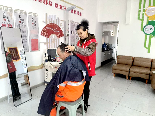 除了上门服务,苏永红还在祥和社区新时代文明实践站设立了“爱心理发点”,专门为外卖员、快递员、环卫工人等新业态从业者免费理发。3月5日“学雷锋日”当天,社区服务大厅里格外热闹,穿着橙色工作服的环卫工人王师傅刚结束早班工作,就赶来理发。苏永红一边剪发,一边和他聊天:“王师傅,最近天气转暖,您在外面作业可得注意防晒啊!”王师傅笑着回应:“有苏大姐给我剪头发,心里暖和,干活都更有劲了!”