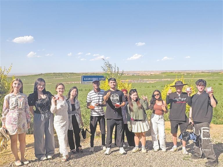 7月7日,北京外国语大学国际学生在中宁县玺赞万亩枸杞园打卡留念。当日,来自意大利、俄罗斯、马来西亚、越南等11个国家的北京外国语大学国际学生到中宁县研学,实地感受中国乡村振兴与特色产业发展,帮助他们更深入地了解中国,讲好中国故事。 宁夏日报报业集团全媒体记者 段春 见习记者 李萌 摄