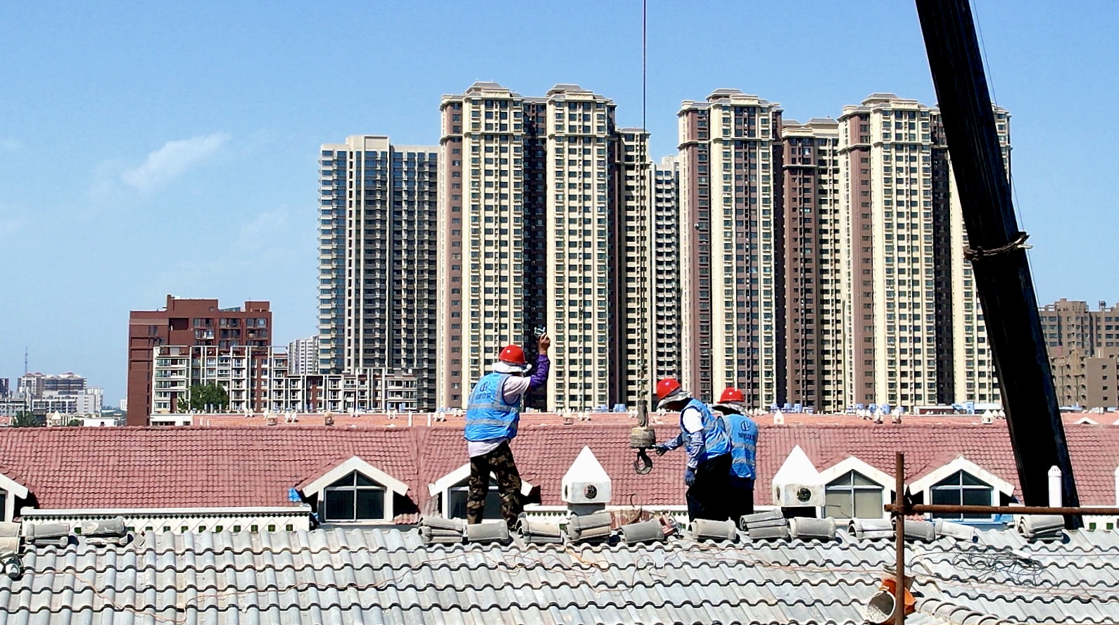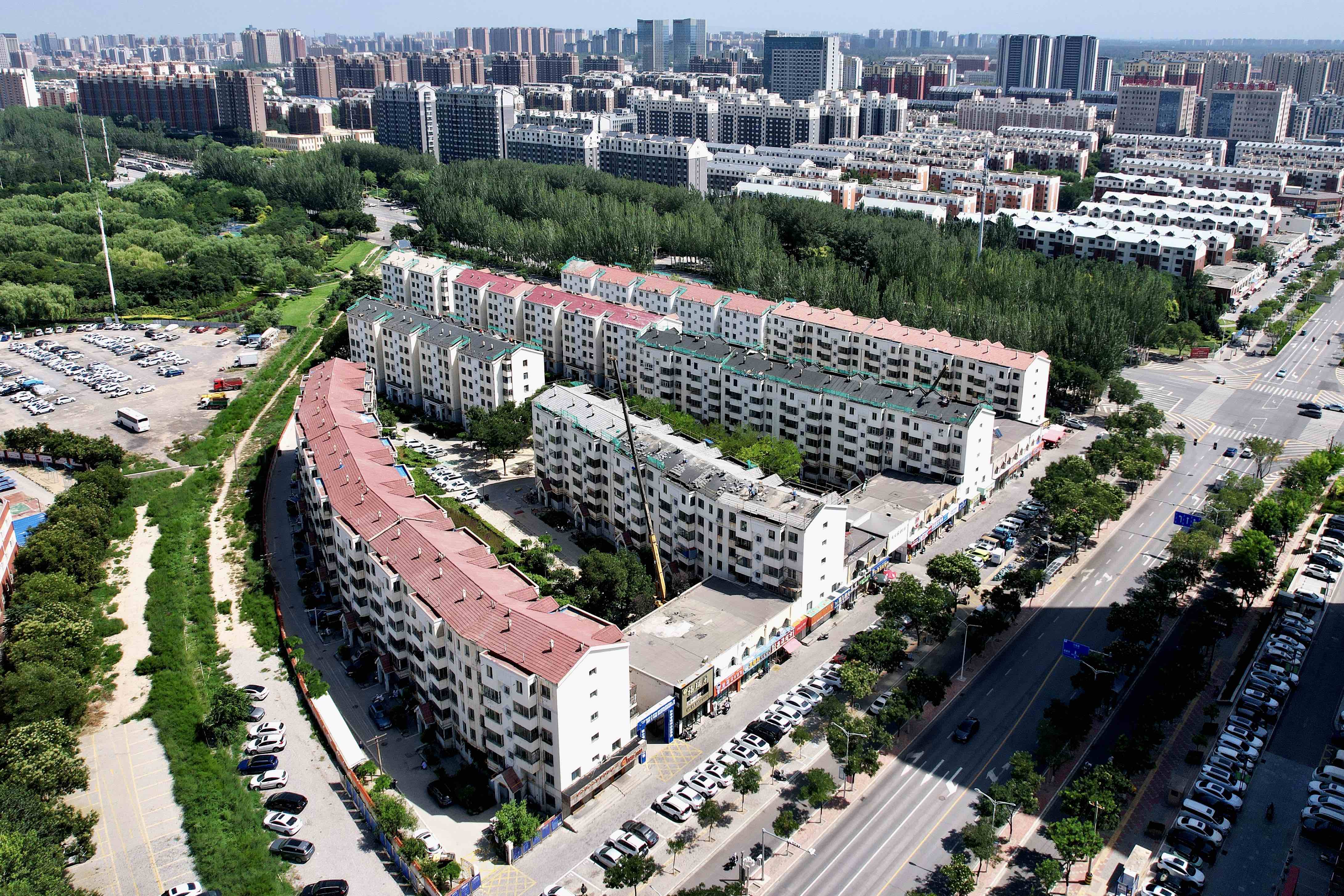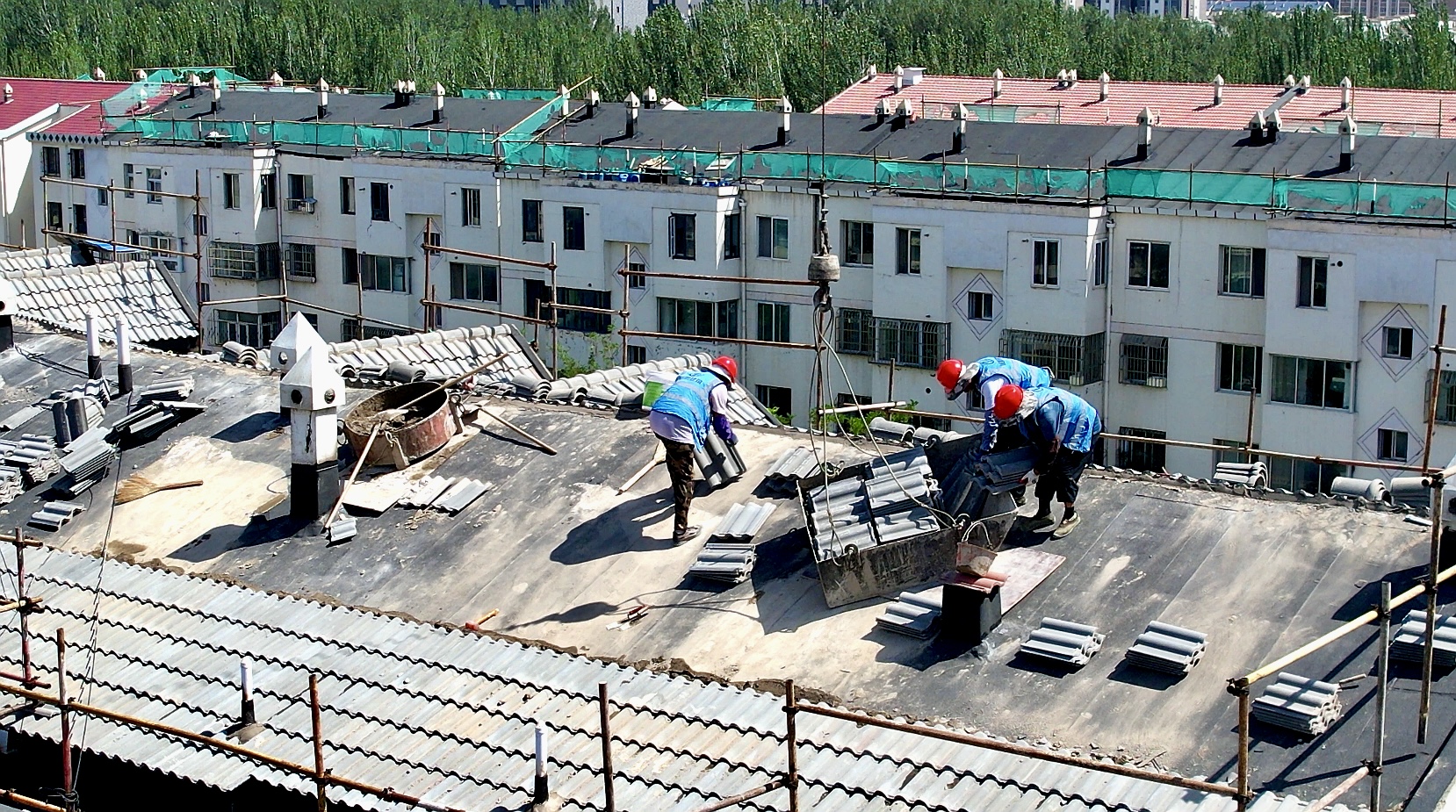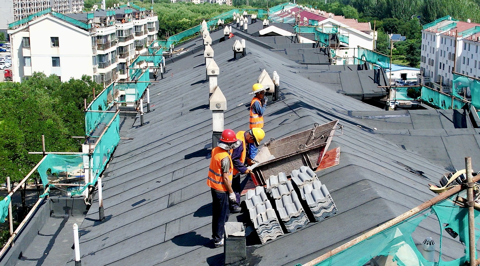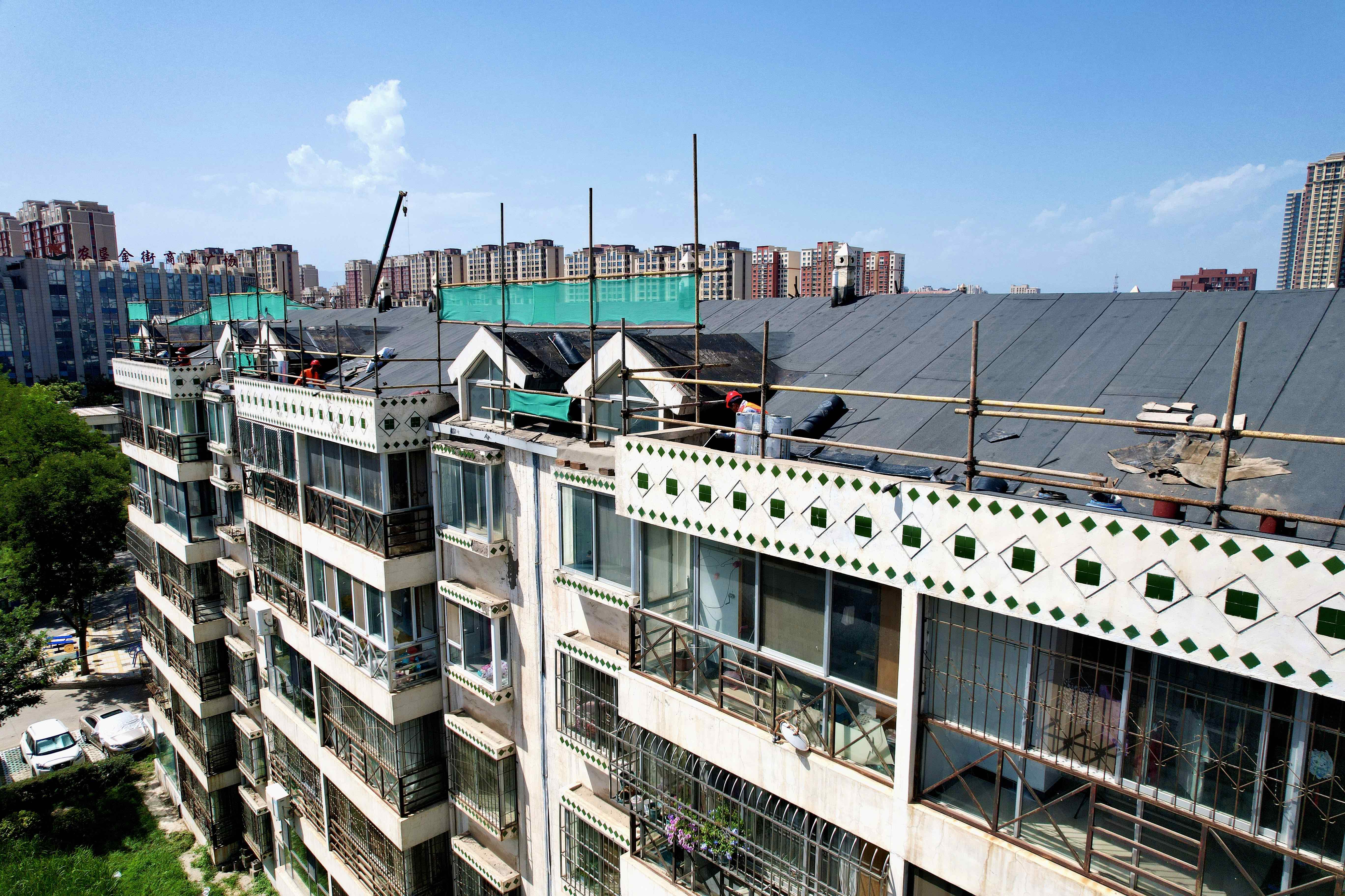 2025年,黄河东路街道金地花园社区结合走访征集的民情民意,申请专项资金对安怡家园E区2、3、4、6、8号楼共22个单元的屋顶进行修缮,修缮面积约4800平方米。该项目于7月进场施工,主要内容包括拆除旧瓦、铺设SBS防水沥青卷材、检查防水无漏点后恢复瓦片、更换加宽型镀锌铁皮雨落管。目前每栋楼施工周期约13天,预计8月底全部完工。
