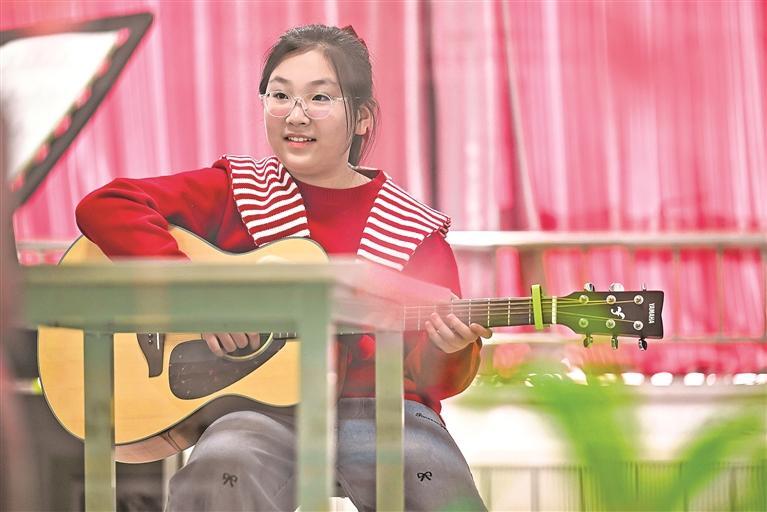 此刻的她,正抱着吉他,与小伙伴们一起跟着老师练琴。王奕婷是银川市金凤区第十一小学五年级的学生,自幼对音乐有着浓厚的兴趣。课余时间,妈妈为她报了声乐和吉他兴趣班,而这一爱好的萌芽,是因为受到了姐姐王怡茗的影响。“姐姐比我大6岁,从小就学古筝,那时候我总站在旁边看,觉得姐姐特别厉害。”王奕婷笑着回忆道,眉眼间满是对姐姐的敬佩。