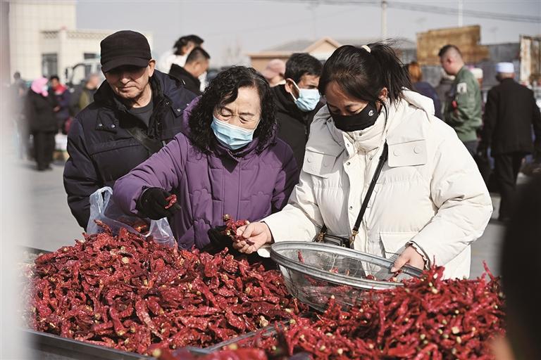 “我赶了大半辈子黄渠桥大集,过去卖自家种的白菜、萝卜,现在批发蔬果、卖本地特产,生意越来越好。”62岁的周建国在黄渠桥大集经营果蔬批发已30余年,他指着摊位前的平罗富硒西瓜、沙地辣椒、新鲜牛羊肉说:“现在路好、车多、物流快,周边农户的新鲜农产品早上采摘,中午就能上集,城里的超市、餐馆都来这儿拿货。大集不仅是百姓的购物场,更是乡村产业的中转站。”
