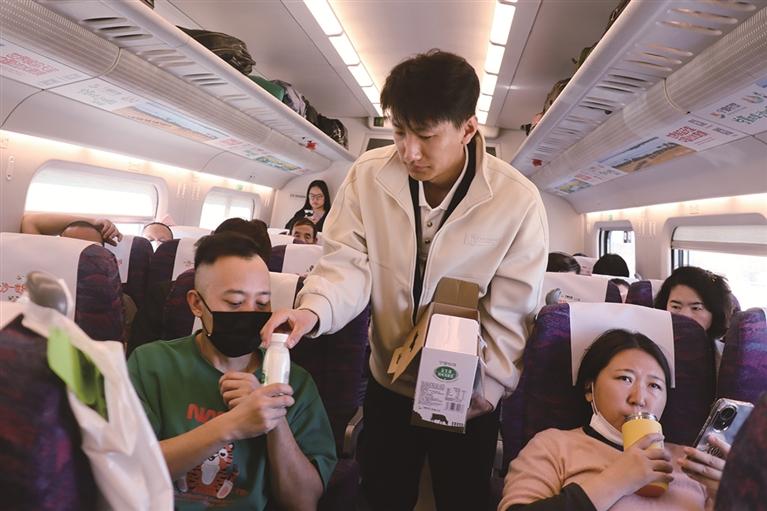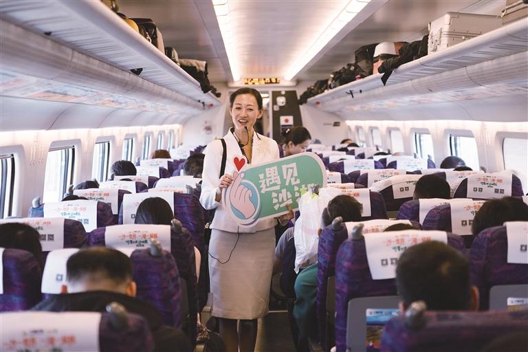 当日9时35分,随着列车鸣笛启程,D1068次列车车厢内的文旅推介扑面而来——沙湖景区的演员们身着汉服,用二胡、琵琶上演了一曲《上春山》,乐声悠扬婉转,如缕缕清风,让人心旷神怡。春已至,芳菲来,列车工作人员给旅客贴心奉上沙湖文旅礼包,细致讲解景区游览攻略与沿线专属优惠政策,搭配趣味互动问答,让旅客在高铁旅途中与“沙水共生、候鸟翩飞”的沙湖独特景致初遇。