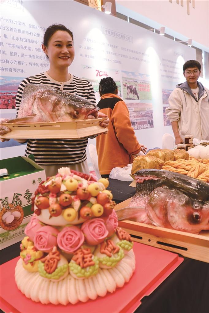 “沙湖大馒头夹牛肉酱是绝配,馒头是手工做的,又香又软。”工作人员向当地市民介绍完沙湖大馒头和秘制牛肉酱后,又抱起一个沙湖大鱼头说,“这个鱼头重15公斤,人放天养,含有丰富的脑白金。”