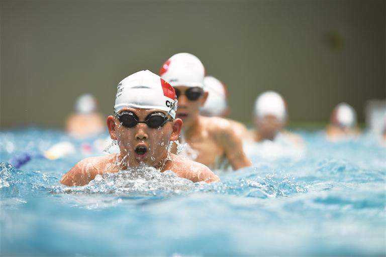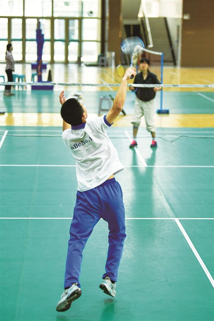 该校九年级学生陶梓阳正与同学打羽毛球,练习一年多羽毛球的他越打越喜欢,游泳更是从小坚持至今。面对即将到来的中考体育,他从容地说:“选考项目多了,大家可以按兴趣和特长发展,不用都练一样的项目。”九年级学生王智潼坦言,自己虽在足球、篮球、排球“三大球”上不占优势,但游泳练了7年,选择擅长的项目应考,心里很有底。
