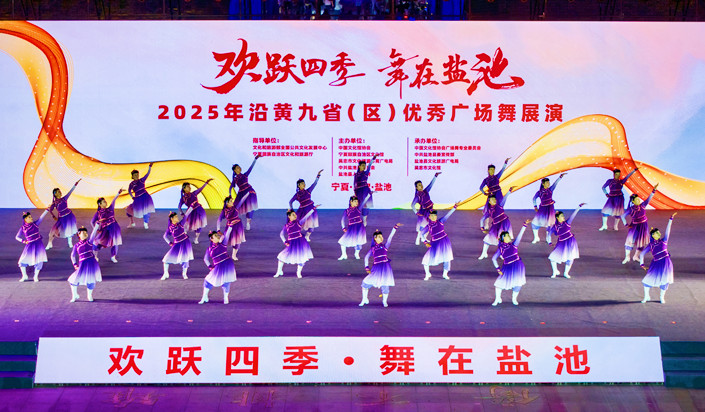7月26日,内蒙古代表队在表演中。当日,“欢跃四季·舞在盐池”2025年沿黄九省(区)优秀广场舞展演在盐池县长城关开幕。来自河南、山东、青海、内蒙古等沿黄九省(区)及长江流域的14支优秀舞蹈团队、360余名舞者同台献艺。宁夏日报报业集团全媒体见习记者 贺静 摄
