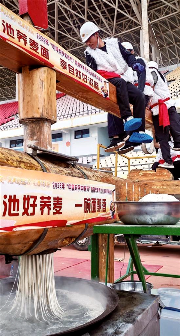 相邻的特色美食展示展销区同样人气爆棚,盐池县特色荞面饸饹宴成为一大亮点。现场架起的巨型传统饸饹床吸引众人围观拍照,压出的荞面饸饹筋道爽滑,搭配精心调制的汤汁或臊子,让食客们品尝到了地道的“盐池好味道”。此外,各种用当地农产品制作的小吃琳琅满目,充分展示了盐池丰富的美食文化。