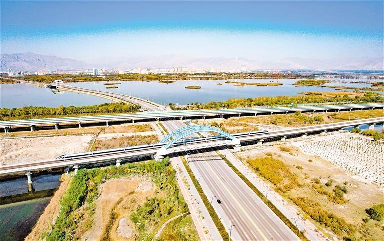 石嘴山市星海湖旁,包银高铁试验列车疾驰而过。
