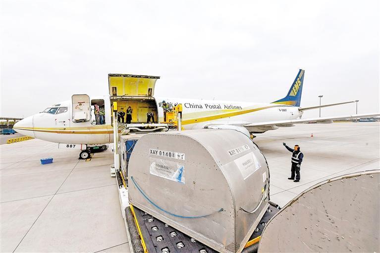 银川河东国际机场,中国邮政的货机在停机坪上装卸货物。