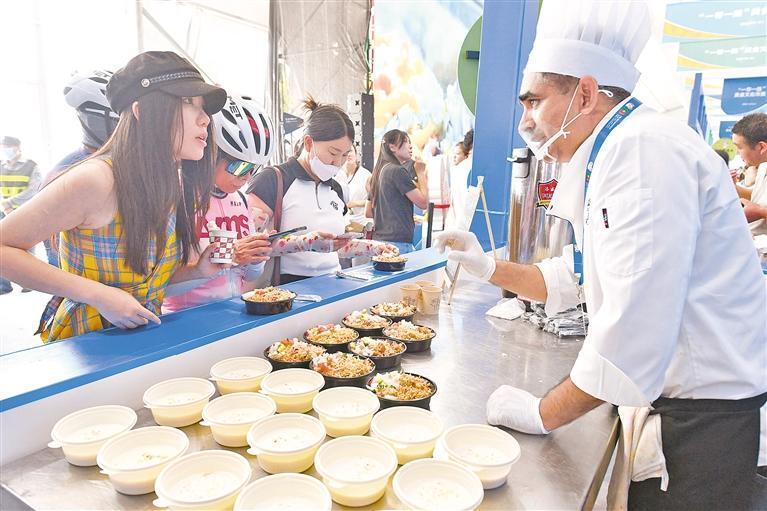 在第七届中阿博览会“一带一路”美食文化市集上,人们品尝美食。