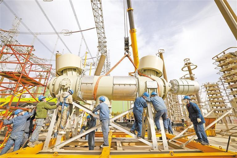 国网宁夏电力有限公司±800千伏特高压灵州换流站,检修人员正在更换交流滤波器场750千伏断路器。“十四五”期间,作为灵绍直流输电工程的送端站,±800千伏特高压灵州换流站保持平稳高效运行,已累计向浙江输送电量突破4142亿千瓦时,相当于替代标准煤超1.55亿吨。图为2022年11月17日拍摄的换流站检修人员在更换交流滤波器场750千伏断路器。记者 党硕 摄
