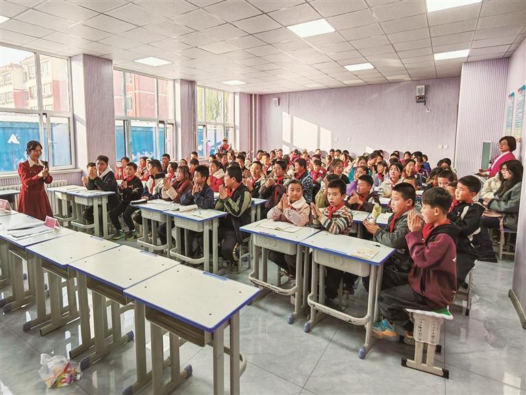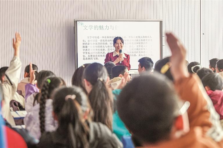 “你们喜欢读书吗?”“小学生如何积累素材进行文学创作?”高红结合自己的创作感悟分享阅读心得和写作技巧。“作家李娟认为‘日常即是素材’,我们要细心观察生活,真诚书写内心所想。”高红示范朗诵舒婷的诗作《祖国啊,我亲爱的祖国》,她以饱满的情感与娴熟的技巧鼓励同学们大胆走上讲台。六年级学生马欣雅声情并茂地朗诵了课文《草原》,让大家仿佛身临其境感受到了草原的恬静与美好。