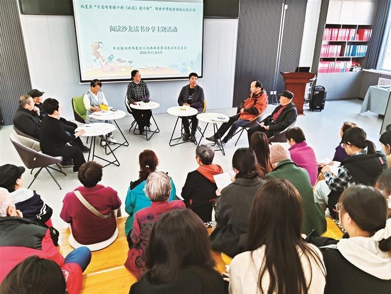 “今天我给大家分享的是《西海固笔记》,这本书兼具红色史诗与地情志书的双重特质,以多维度视角勾勒出西北古城的精神脉络与发展轨迹……”在西夏区文昌路街道翟靖巷社区新时代文明实践站举行的“读经典·传文化”阅读沙龙读书分享主题活动中,作家田晓慧与社区居民围坐一圈,以经典读物为媒,分享阅读心得与文化记忆,引发众人共鸣。这场分享会不仅拉近了邻里距离,更让中华优秀传统文化在轻松的氛围中扎根社区、浸润人心。