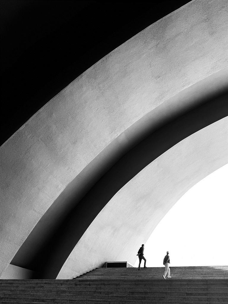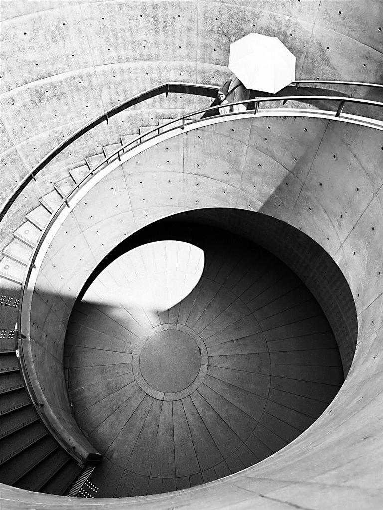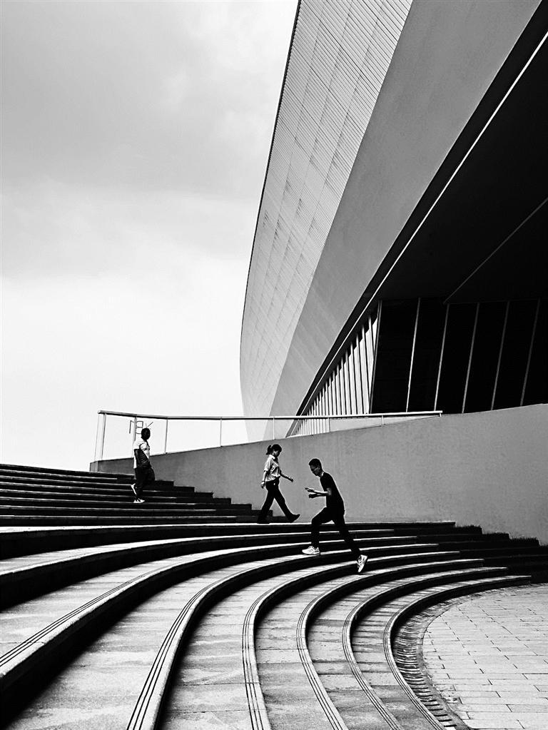 当镜头褪去斑斓,极简的构图便成了主角。一道线的延伸、一块影的留白、一个瞬间的定格,都在无声诉说着被忽略的细节与力量。画面中螺旋楼梯盘旋上升,弧形墙在负空间中勾勒出流动的韵律,几何立面则以重复的模块化结构,构建起理性秩序。摄影师巧妙运用明暗对比法强化建筑骨骼,天台人影的渺小与建筑体量的宏大形成戏剧张力,而弧形墙面的渐变灰阶则赋予静态结构动态呼吸感。