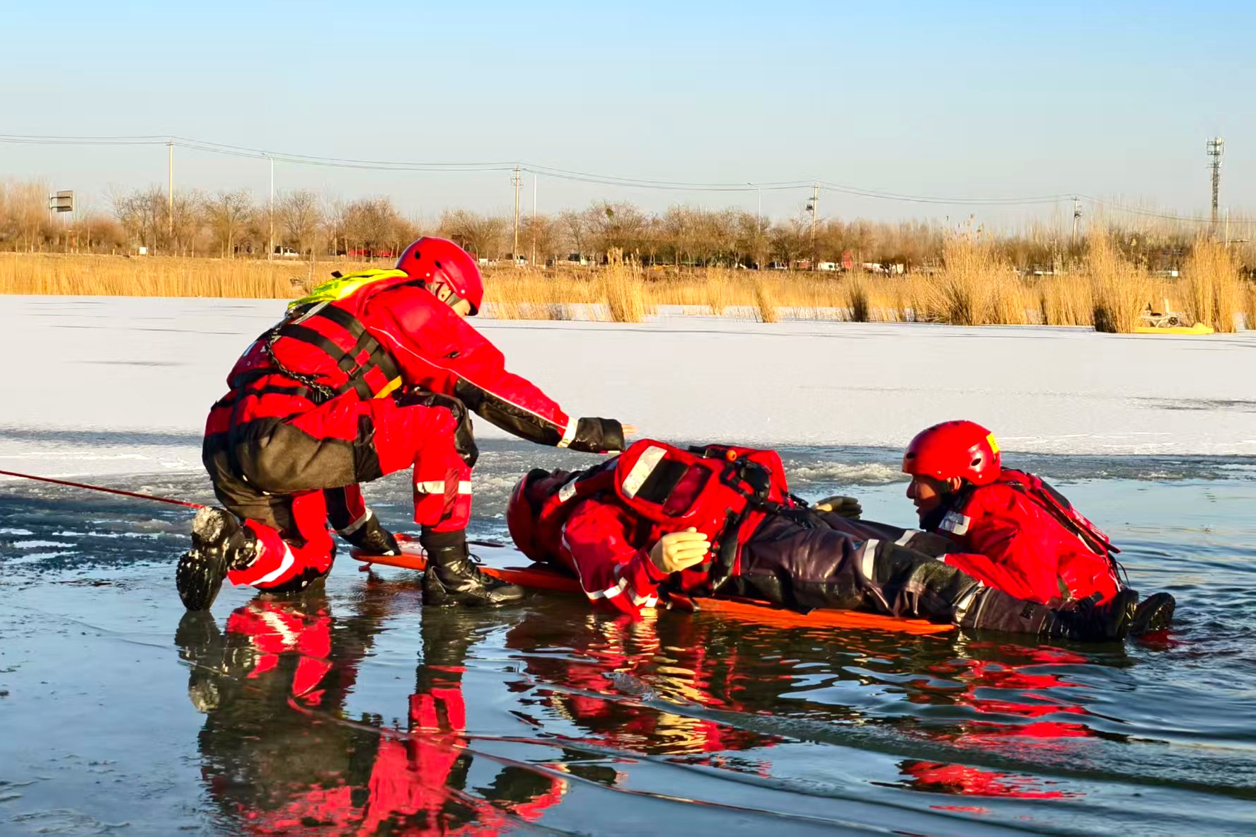 1月11日,宁夏消防救援总队特勤支队在银川市孔雀湖开展冰域救援实战演练。连日来,全区各地消防陆续开展冰域救援授课暨实战演练活动,全面检验消防队伍在极端天气下的快速响应和专业处置能力,为高效应对冬季冰域突发事故奠定坚实基础。宁夏日报报业集团全媒体记者 苏克龙 摄