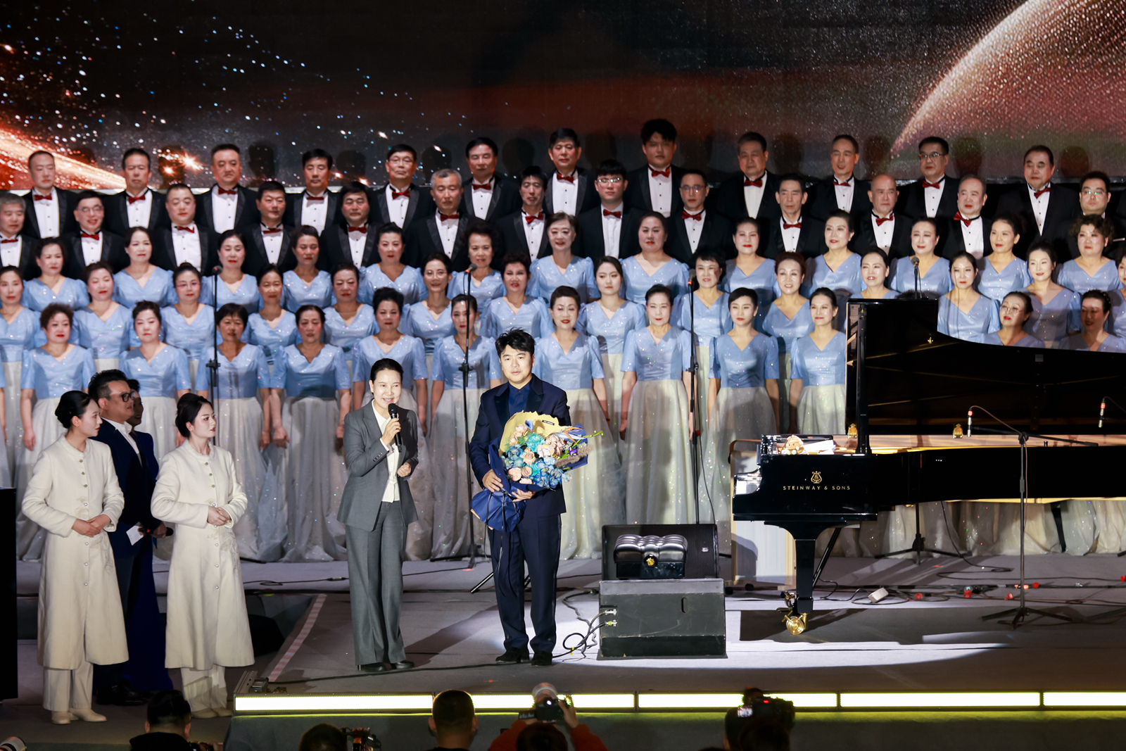 演出最动人的篇章,始于致敬平凡奋斗者视频的温情播放。郎朗与宁夏老年大学桃李分校合唱团的同台共演更将氛围推向高潮。平均年龄逾六十岁的合唱团成员身着统一礼服,精神矍铄,当《我和我的祖国》的旋律响起时,灵动琴音与真挚歌声交织,西方古典与本土情怀完美融合,谱写出跨越代际的艺术交响。