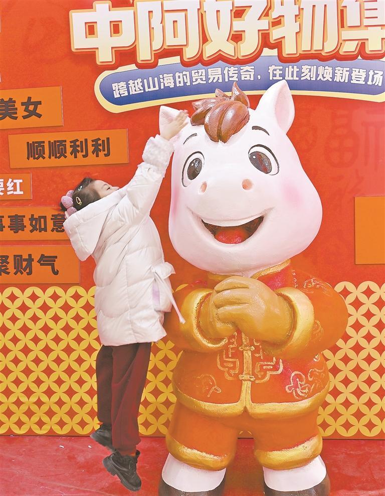 一名小朋友在银川步行街与马年玩偶“互动”。