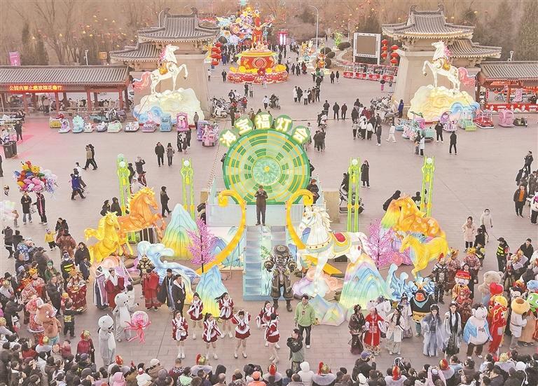 夜幕降临,银川海宝公园“海宝福灯会”亮灯。八大骏意象主题区域的41组大型花灯依次点亮,吸引众多市民驻足观赏。银川花卉博览园内,“山海灯会”则以传统花灯融合现代光影技术,打造一场别具一格的视觉盛宴。其中,以马为主题的彩灯尤为引人注目,在光影流转间跃动如生,仿佛正引领人们奔向崭新的一年。
