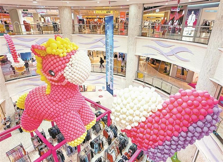 银川一商场内,一匹气球扎制的飞马悬浮在空中。