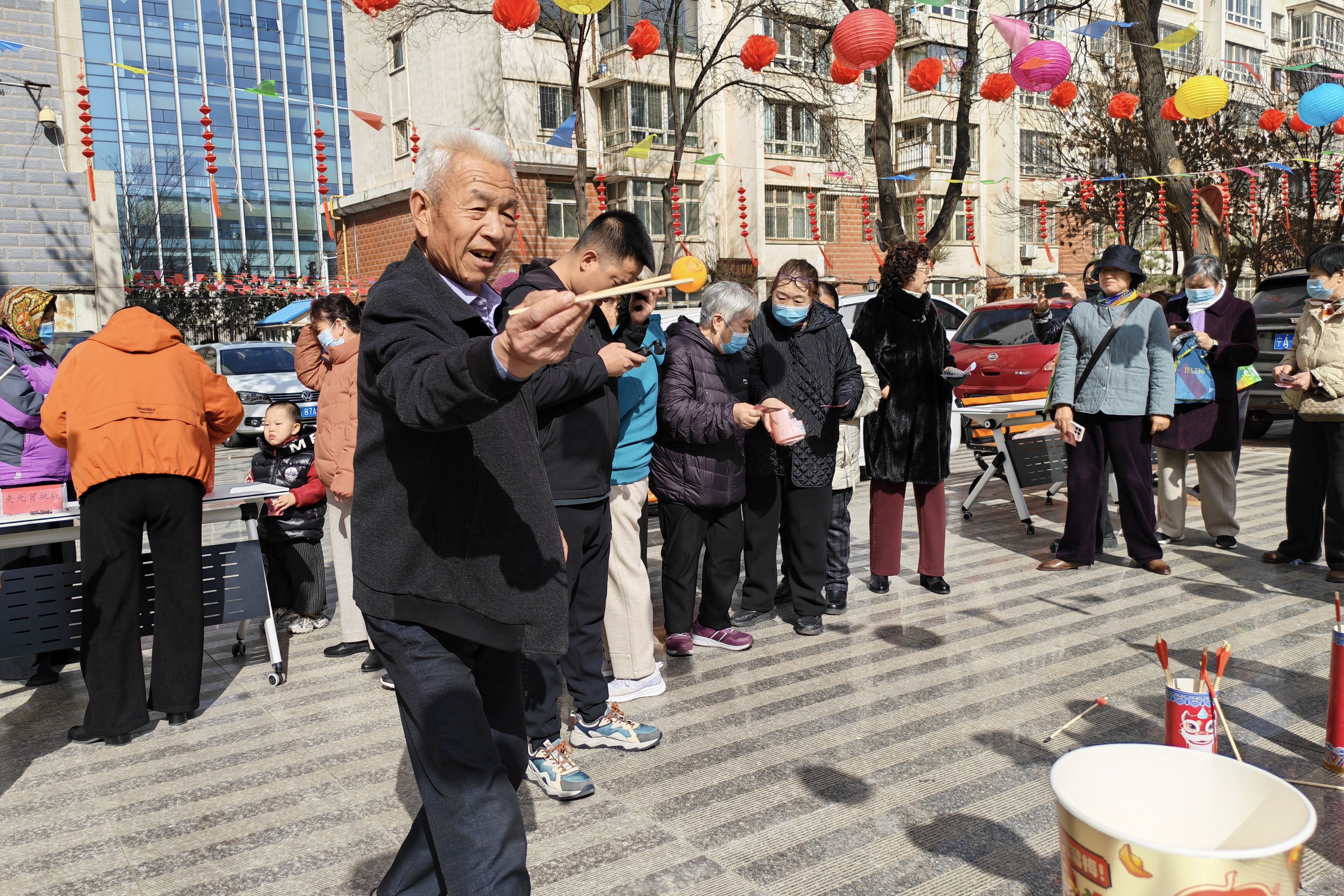 猜灯谜区,大家围聚在一起,你一言我一语争相破解谜底,不时传出阵阵欢呼;投壶区里,老人孩子齐上阵,瞄准、投掷,动作虽显笨拙却满是欢喜,笑声不断;夹元宵环节最考验手稳,筷子夹着圆滚滚的汤圆,稍有失误便引来一阵善意的哄笑,大家相互打趣、其乐融融;套圈区排起了小长队,套中的业主喜滋滋地领奖,没套中的也不气馁,撸起袖子再来一轮。老人们三五成群地唠着家常,孩子们满场撒欢嬉戏,原本不太熟络的邻居,碰面道一声“元宵快乐”,陌生感悄然消散。