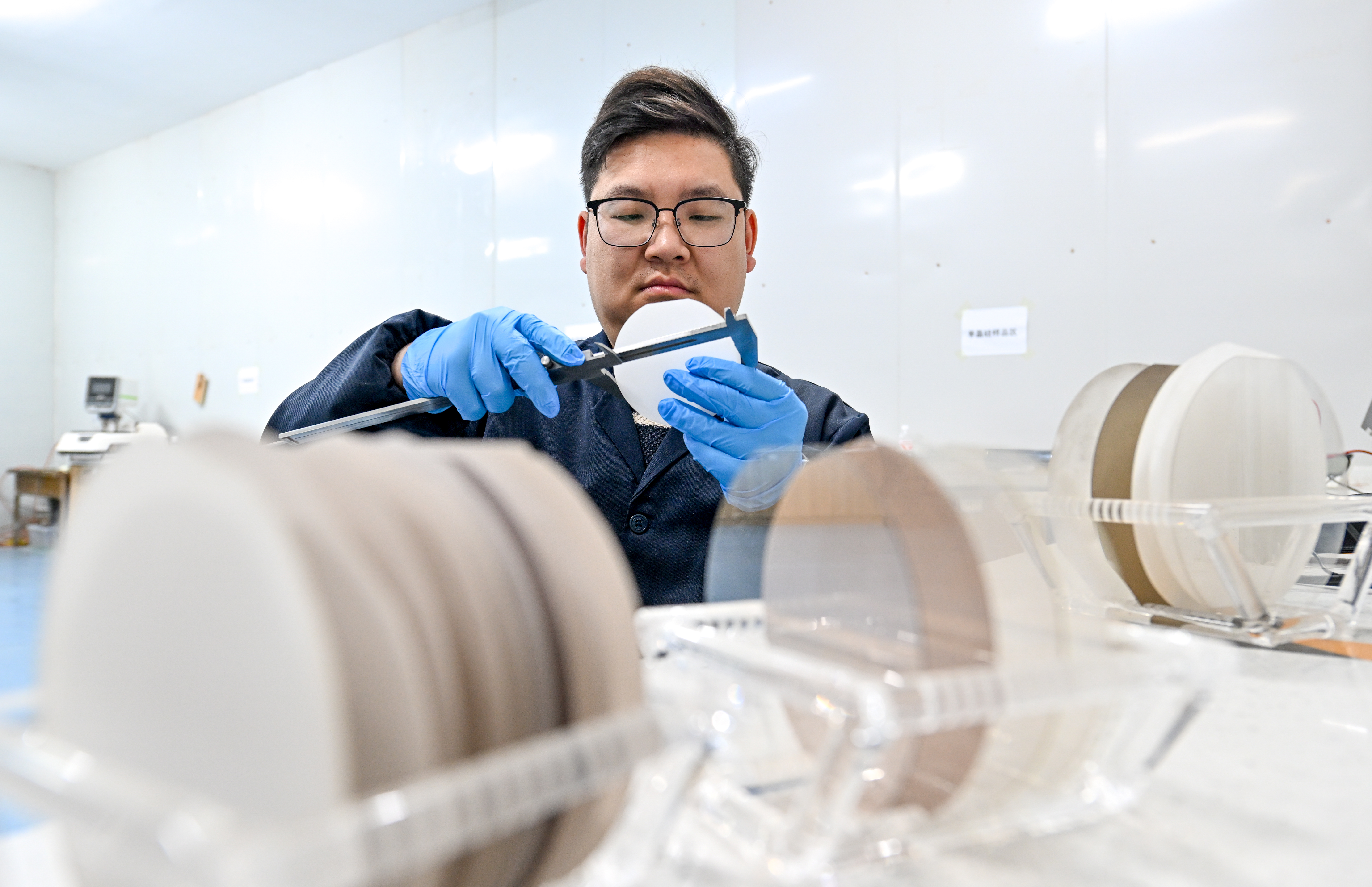 4月23日,石嘴山高新区中小企业科技孵化园,宁夏钜晶源晶体科技有限公司工作人员测量钽酸锂晶圆尺寸。该公司生产的钽酸锂晶圆应用于国产5G射频芯片,成本较进口降低40%。记者 王晓龙 白茹 摄