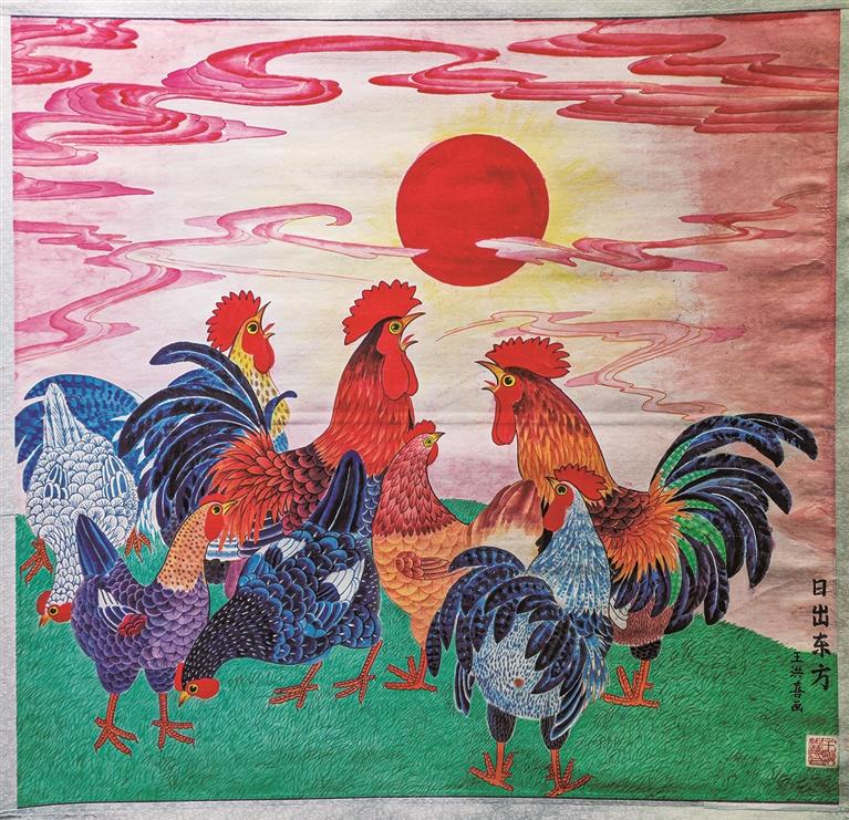 一出门,天都快亮了,自家养的大公鸡踱着方步,伸颈抬头,“扑棱棱”飞上院墙,“喔喔喔”一声长啼,叫亮了东边的日头,也唤醒了王洪喜的灵感。“对啊,画个‘金鸡报晓’,又喜庆又热闹,多好!”
