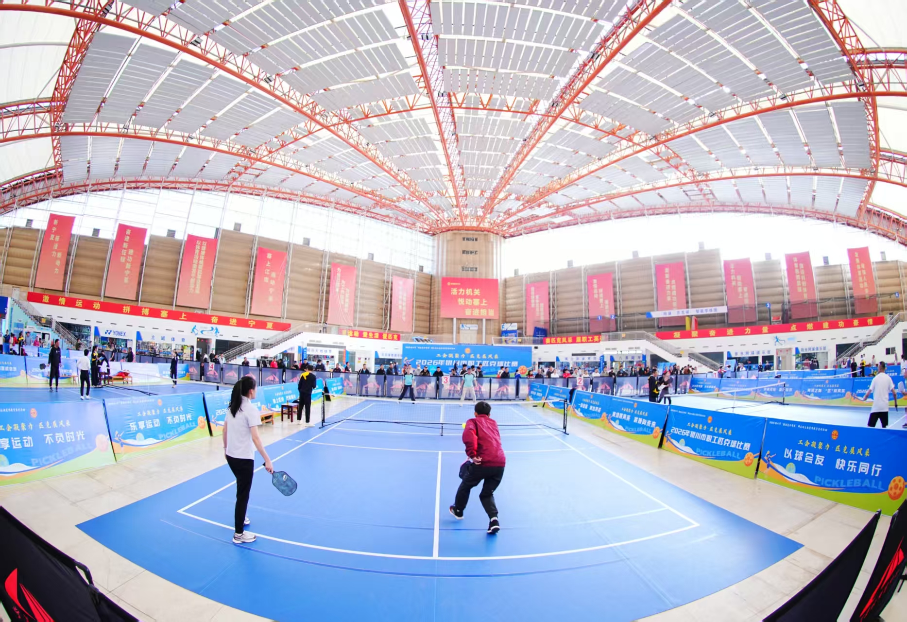 宁夏新闻网讯(记者 闫文丽 文/图)4月18日上午,2026年银川市职工匹克球比赛在宁夏亲水体育中心火热开打。来自银川市各基层工会的24支代表队、200余名职工选手脱下工装、换上运动装,在球场上挥洒汗水,享受运动的快乐。