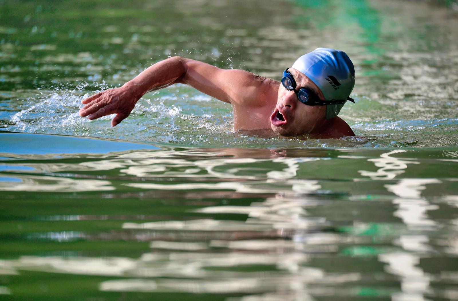 1月4日,冬泳爱好者在银川市兴庆区北塔湖游泳。当天,银川市最低气温降至-11℃。银川市冬泳协会自2013年成立以来,已从最初的数十人发展到如今的百余人,年龄最大的近九旬,大家常年坚持户外游泳,增强体质。记者 马楠 马赛尔 摄