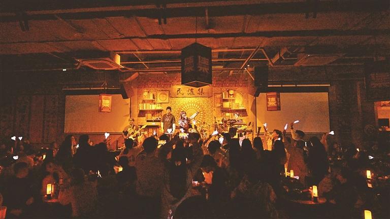 2025年12月22日21时许,位于银川市悦海新天地商圈内的民谣集里坐满了人。暖黄色的灯光下,原木桌椅泛着温润的光,墙上挂着的民族风挂毯和旧收音机,让人一瞬间放松下来。舞台中央,吉他手正弹唱着舒缓的民谣,空气里混着烤肉的焦香和淡淡的酒气。