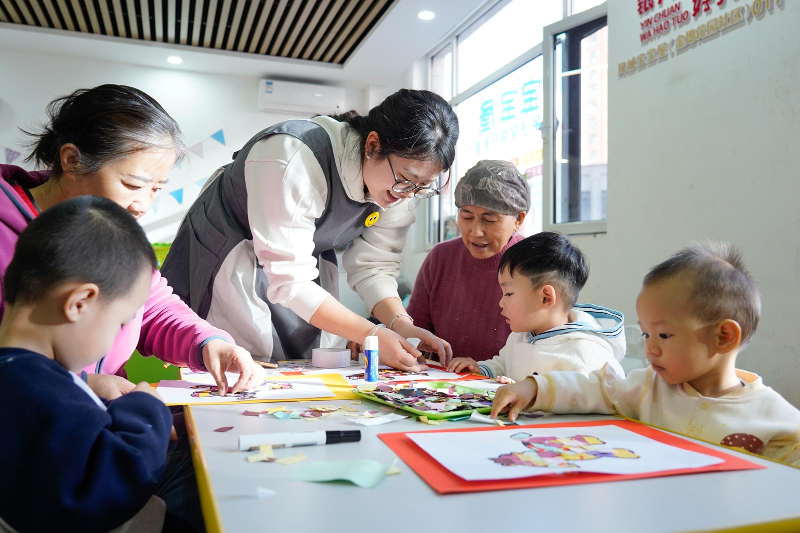 1月8日上午,在银川市金凤区黄河东路街道金地花园社区“凤城宝宝屋”,育儿老师带领小朋友做手工。作为中央财政支持的普惠托育示范项目,黄河东路街道“凤城宝宝屋”已在湖畔嘉苑西区社区、金地花园社区、新苑社区落地,构建起覆盖辖区的“15分钟就近托育婴幼儿照护服务圈”,为0—3岁婴幼儿家庭解决照护难题。宝宝屋的照护人员均持有育婴师或幼儿教师资格证,经系统培训后上岗。他们不仅提供基础生活照料,还通过游戏互动、绘本阅读等特色活动,促进婴幼儿综合能力发展。宝宝屋采用“政府补一点、机构让一点、家庭付一点”的三方分担模式,提供亲子早教课程、半日托、临时托等服务,按次收费,满足不同家庭需求。自去年3月试运营以来,3家社区宝宝屋日均服务婴幼儿15人次以上。宁夏日报报业集团全媒体见习记者 乔新宇 摄